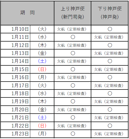 ➀神戸航路:2023年1月10日上り便~1月23日下り便